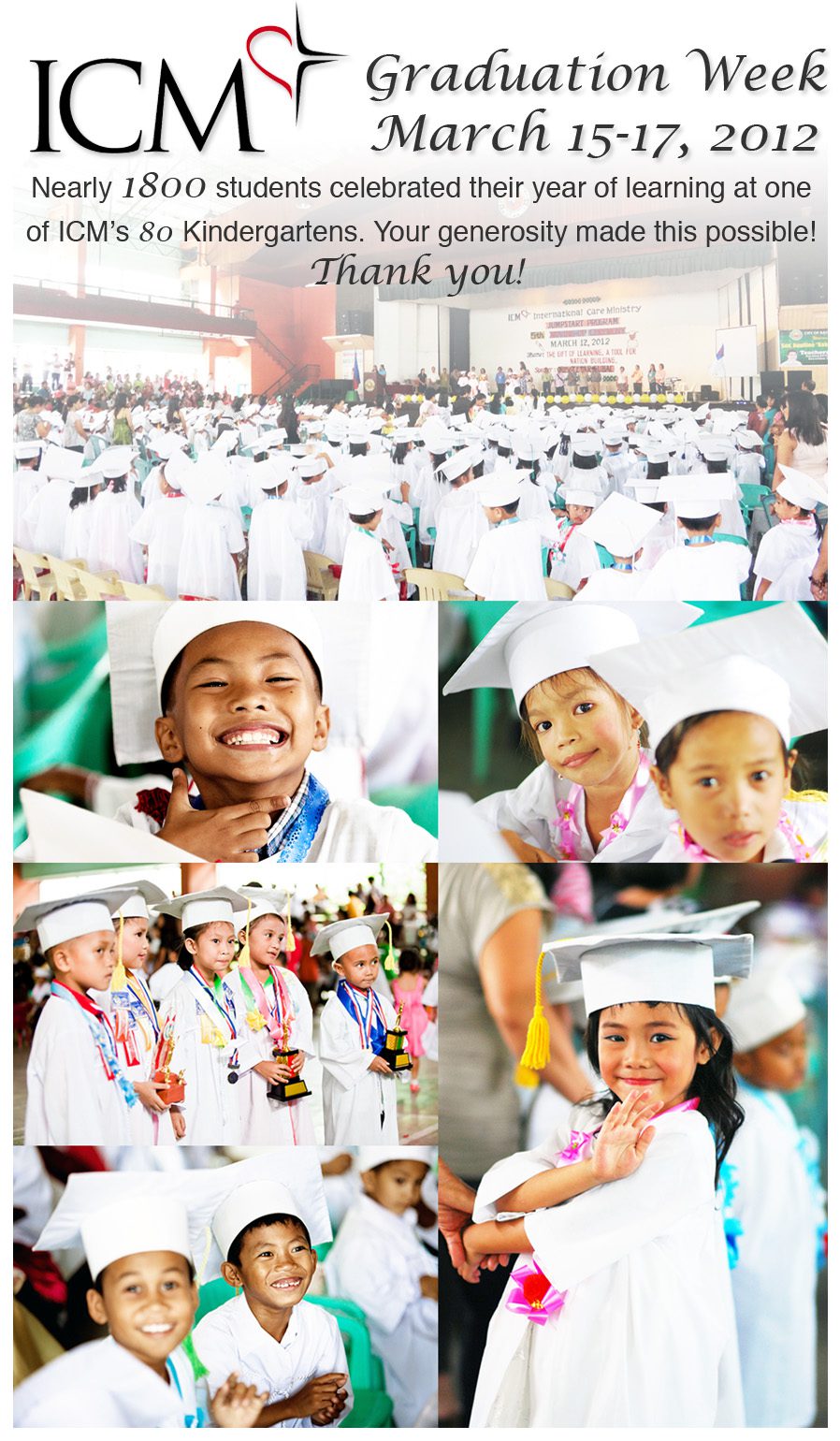 Nearly 1800 excited students proudly received their diplomas during graduation week after completing their year of learning at one of ICM’s 80 Kindergartens. These formal graduation celebrations were held in each region so family members and friends could come and cheer their student as they walked across the stage. There was much to celebrate as songs were sung, verses recited and awards given. Thank you to all the generous Kindergarten Sponsors who made this possible!