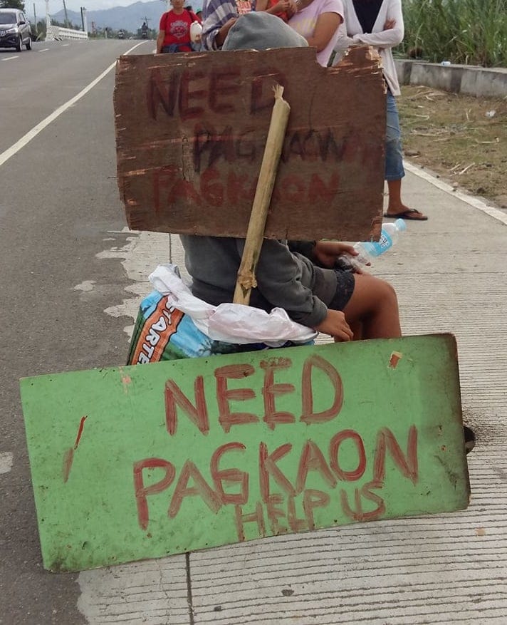 Signage (Need Food, Help Us) beside the Street of Bais City