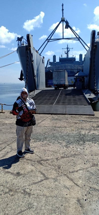 ICM Pastor Ambet Arguelles with the Philippine Navy vessel BRP Bacolod City LS550 where the ICM relief goods were loaded for shipping to Palawan.